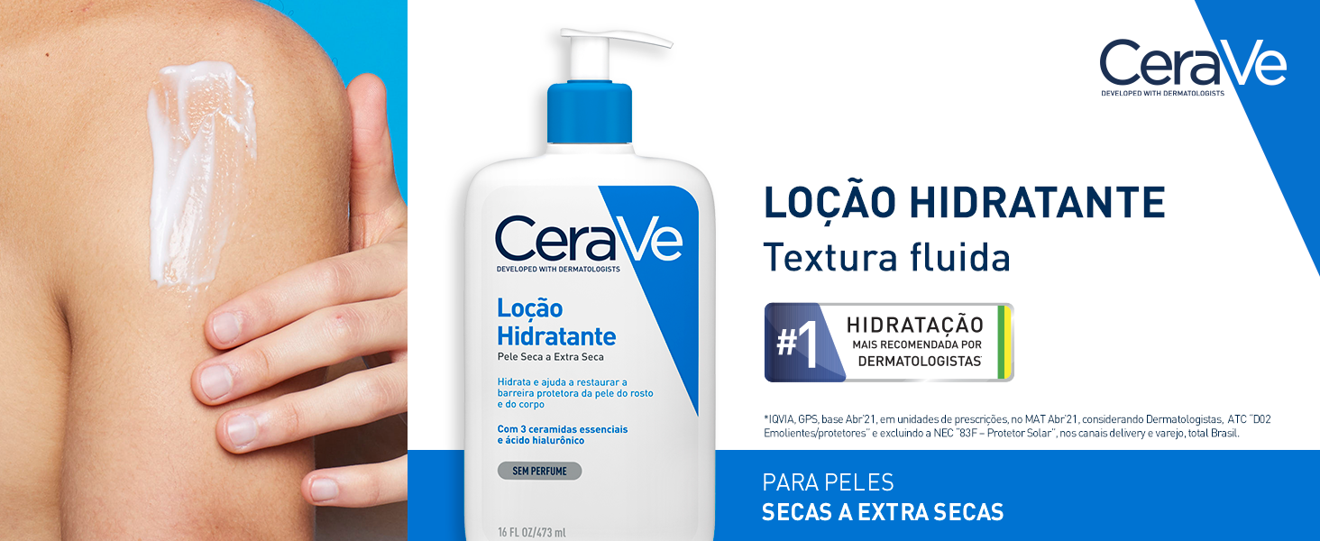 Detalhes: Desenvolvido com dermatologistas, CeraVe Loção Hidratante hidrata e ajuda a restaurar a barreira protetora da pele. Esta fórmula leve e não oleosa contém as 3 ceramidas essenciais para a pele + ácido hialurônico, promovendo hidratação o dia todo através de sua exclusiva tecnologia MVE, de liberação prolongada de ativos hidratantes. Indicado para pessoas com pele seca a extra seca, sua textura é fluida e de rápida absorção para uma sensação suave na pele. – Ajuda a restaurar e manter a proteção da barreira natural da pele. – Liberação prolongada de ativos para uma hidratação que dura o dia todo. – Ajuda a reter a hidratação natural da pele. – Suave na pele: Fórmula de rápida absorção. – Não obstrui os poros. – Sem perfume. Principais Ativos: – Tecnologia MVE: Este sistema de liberação patenteado libera continuamente ingredientes hidratantes para uma hidratação 24 horas – Ceramidas: Essenciais para uma pele saudável, as ceramidas ajudam a restaurar e manter a barreira natural da pele – Ácido hialurônico: Este ingrediente atrai hidratação para a superfície da pele e ajuda a pele a reter a umidade CeraVe: Desenvolvido com Dermatologistas. Produto foi desenvolvido com base em informações e necessidades indicadas por dermatologistas. Em 2005, os dermatologistas da CeraVe desenvolveram uma linha de produtos para a pele enriquecidos com uma mistura de três ceramidas essenciais (ceramidas 1, 3 e 6-II), ácidos graxos e outros lipídios para ajudar a reparar e fortalecer a barreira natural da pele.