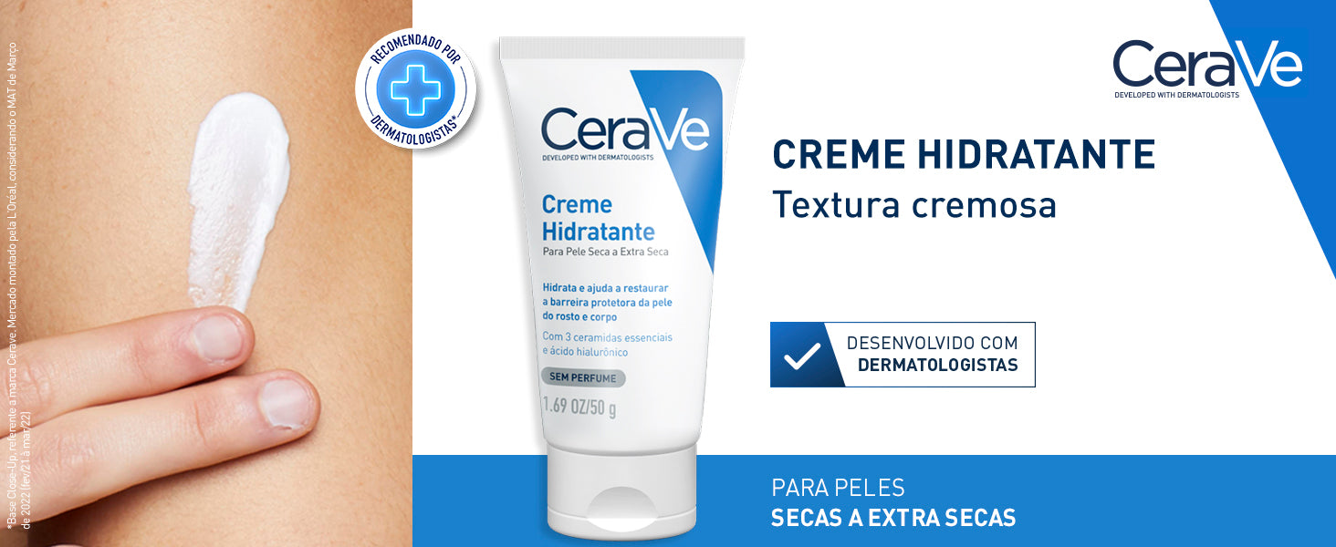 Detalhes: Desenvolvido com dermatologistas*, CeraVe Creme Hidratante hidrata e ajuda a restaurar a barreira protetora da pele. Esta fórmula rica e não oleosa contém as 3 ceramidas essenciais para a pele + ácido hialurônico, promovendo hidratação o dia todo através de sua exclusiva tecnologia MVE, de liberação prolongada de ativos hidratantes. Indicado para pessoas com pele seca a extra seca, sua textura é cremosa e de rápida absorção para uma sensação suave na pele. – Textura Cremosa – Ajuda a restaurar e manter a proteção da barreira natural da pele. – Liberação prolongada de ativos para uma hidratação que dura o dia todo. – Ajuda a reter a hidratação natural da pele. – Suave na pele: Fórmula de rápida absorção – Não obstrui os poros. – Sem perfume. O Creme Hidratante CeraVe atua tanto na hidratação efetiva quanto na restauração da barreira protetora da pele. Desenvolvido com dermatologistas e ideal para peles secas e muito, este creme hidratante rico, não oleoso e de absorção rápida, apresenta a patenteada Tecnologia de Liberação MVE para liberar um fluxo constante de ácido hialurônico e três ceramidas essenciais ao longo do dia e da noite. Indicado para peles sensíveis, este creme de ceramida livre de óleo e sem perfume também ajuda a pele a manter a hidratação enquanto melhora a sua aparência. Adequado para pele seca e muito seca no rosto e corpo Principais Ativos: -Tecnologia MVE: Este sistema de liberação patenteado libera continuamente ingredientes hidratantes para uma hidratação 24 horas -Ceramidas: Essenciais para uma pele saudável, as ceramidas ajudam a restaurar e manter a barreira natural da pele -Ácido hialurônico: Este ingrediente atrai hidratação para a superfície da pele e ajuda a pele a reter a umidade -Não comedogênico, livre de óleo, hipoalergênico, sem fragrância e adequado para peles sensíveis *CeraVe: Desenvolvido com Dermatologistas. Produto foi desenvolvido com base em informações e necessidades indicadas por dermatologistas. Em 2005, os dermatologistas da CeraVe desenvolveram uma linha de produtos para a pele enriquecidos com uma mistura de três ceramidas essenciais (ceramidas 1, 3 e 6-II), ácidos graxos e outros lipídios para ajudar a reparar e fortalecer a barreira natural da pele. Atualmente, a CeraVe oferece mais de 70 produtos desenvolvidos para hidratar, restaurar e reabastecer todos os tipos de pele. Aplicar generosamente nos pés sempre que necessário. Esfoliação e hidratação são essenciais para pés suaves e macios. Recomendamos um creme para os pés com ácido salicílico, como o Creme Renovador de Pés CeraVe, que ajuda a eliminar o acúmulo de células mortas e proporciona uma hidratação duradoura. Ingredientes adicionais como ácido hialurônico, retém a umidade, e a niacinamida promove uma ação calmante e ajudam a suavizar a pele áspera. Além disso, a presença das ceramidas repoe as ceramidas naturais da pele para ajudar a manter a hidratação.